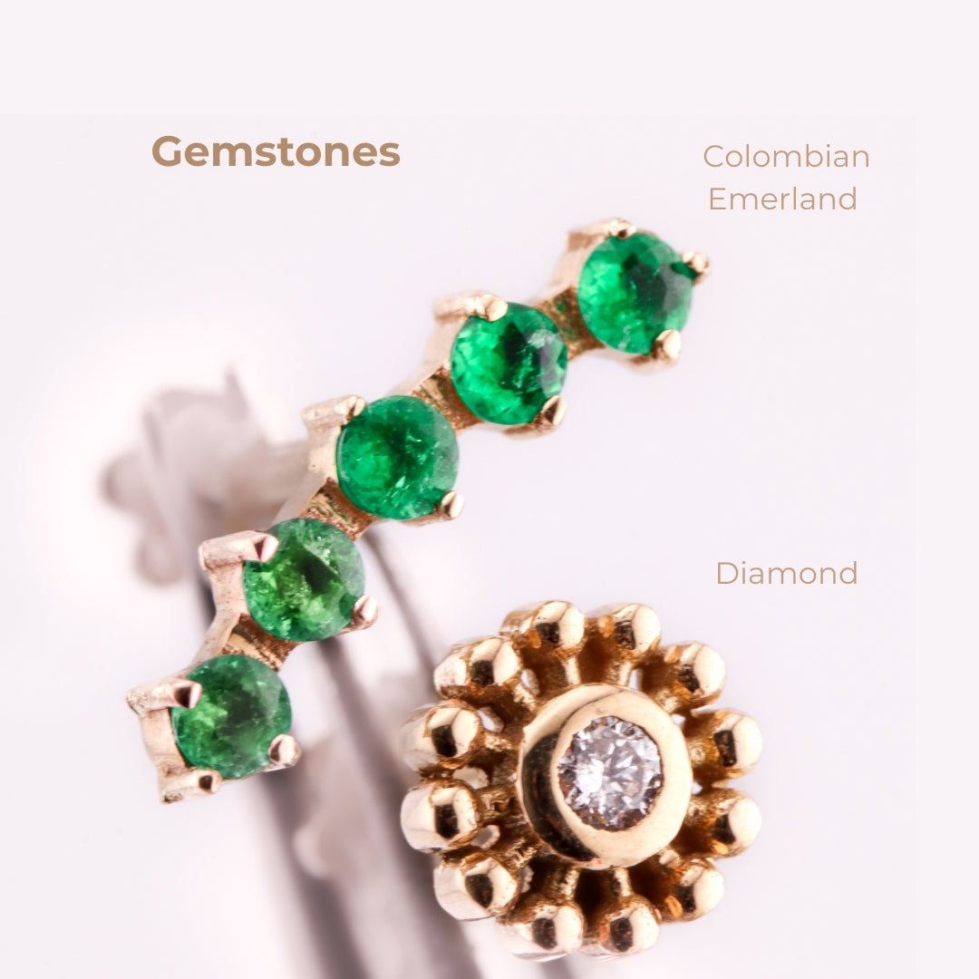 Esmeraldas colombianas y diamantes naturales engastados en oro de 18 k aportan un lujo atemporal a tus piercings; cada gema se selecciona por su color, pureza y origen responsable.