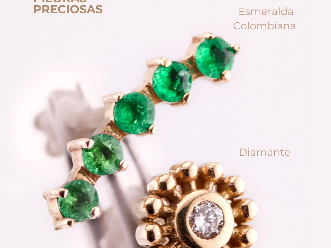 - Oro 18K con diamantes y esmeraldas: lujo duradero y hipoalergénico.